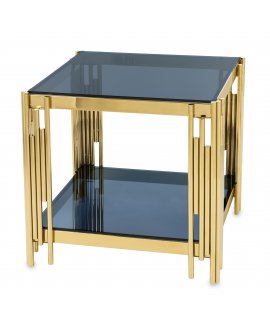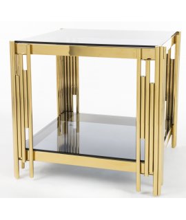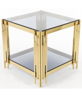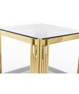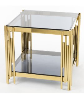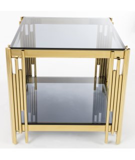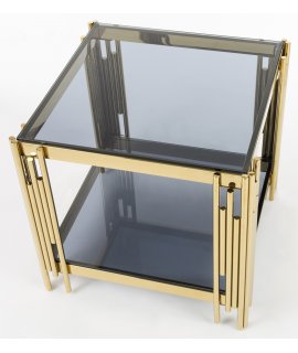 Stolik jest w kolorze złotym. Blat wykonany jest ze szkła w kolorze szarym. Stolik posiada 2 poziomy. Mebel jest z kolekcji Vetrario.