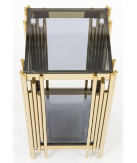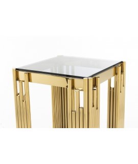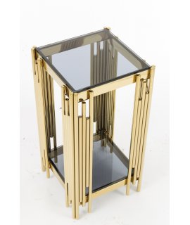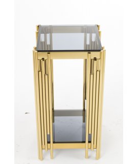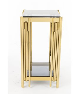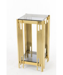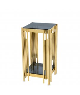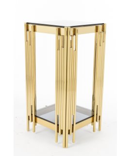 Kwietnik jest w kolorze złotym. Blat wykonany jest ze szkła w kolorze szarym. Kwietnik posiada 2 poziomy. Mebel jest z kolekcji Vetrario.