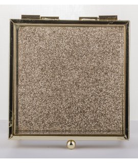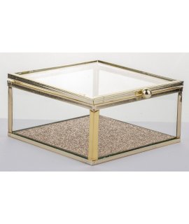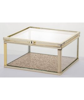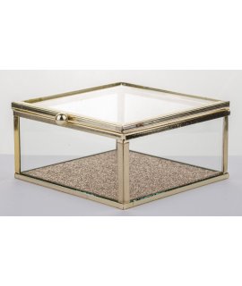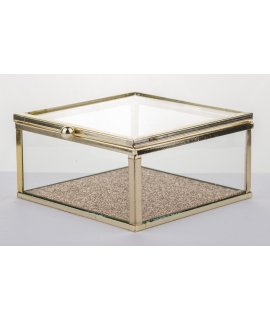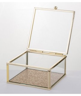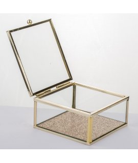 Przeszklona szkatułka na biżuterię, z metalową oprawą w kolorze złotym.